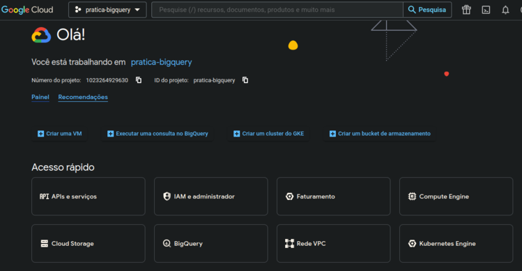 Para obter esse arquivo .JSON, você precisará acessar o link principal do Google Cloud BigQuery e navegar até as configurações do seu projeto.